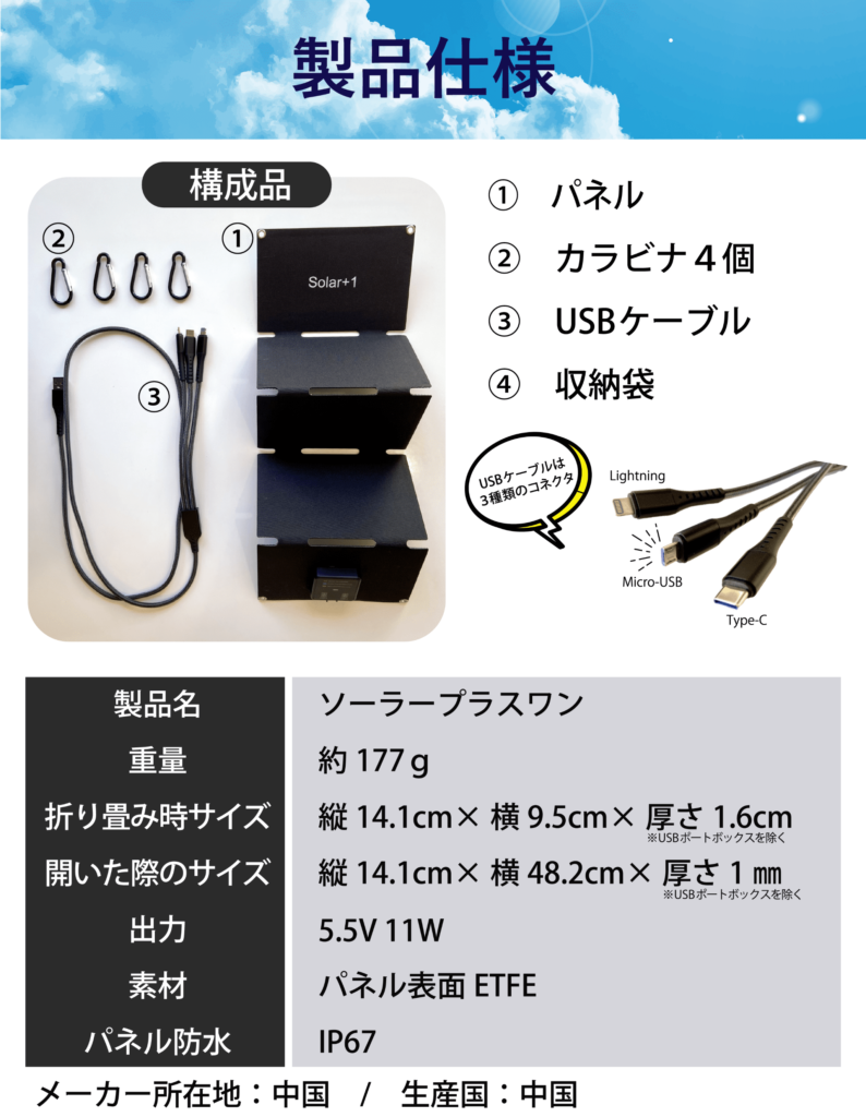 A:製品本体に蓄電はできません。市販のモバイルバッテリーにSolar+1をつなげて蓄電することが可能です。